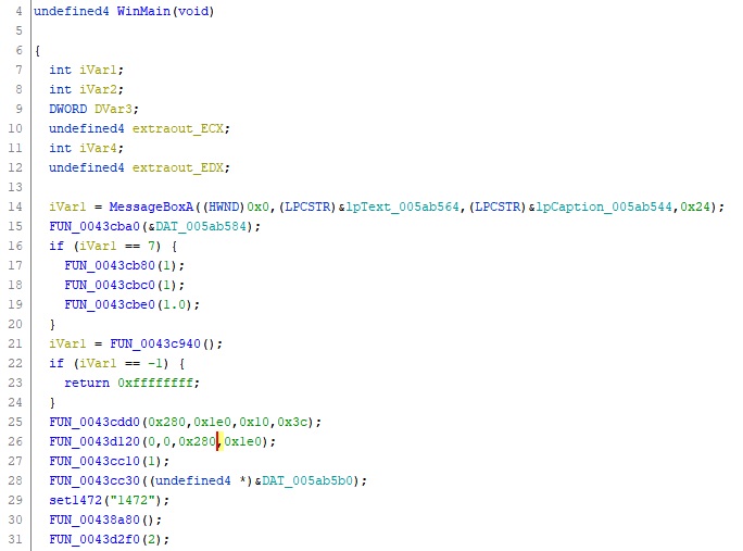 This is the first time I’ve tried to analyze a Windows binary with Ghidra but I knew from past experiences that the entrypoint is not the classic main function but WinMain. After having found the entrypoint I’ve tried to understand from high level what it was trying to do: