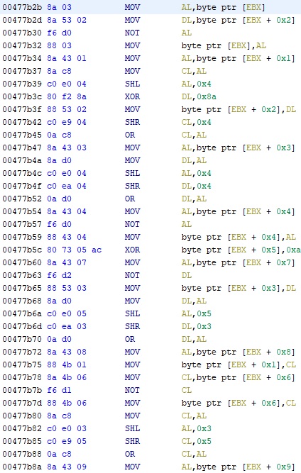 I can’t report the full function here (and the decompiled form is even worse) but this is most likely a scrambling procedure. At this point I was interested to see the result of this operation but I didn’t wanted to reimplement the procedure so I’ve taken note of its location and I’ve decided to execute the game in a debugger and then I’ve retrieved the final value.