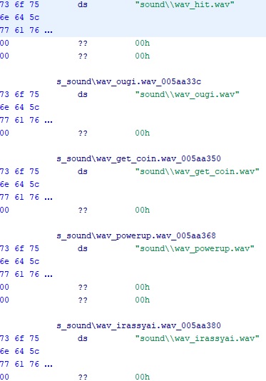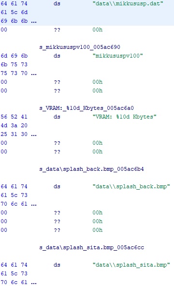 After this I searched for how the game knows it has to search for the file “data.dat”: the .dat part is from the string set in the WinMain, while the data part is from an argument: the main function of this chain has, as an argument, the string “data\MIKKUSUSP.DAT”. This gave me an insight on how the game asks to load an asset in memory: it uses a format where the first part is the archive to use (for example data) and the second part is the name of a file in the archive. After a quick search in the .exe I’ve found this list of strings: