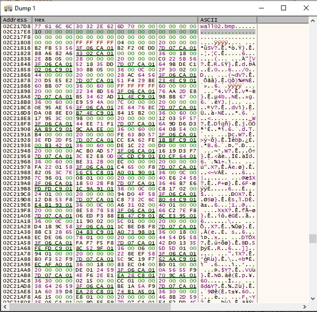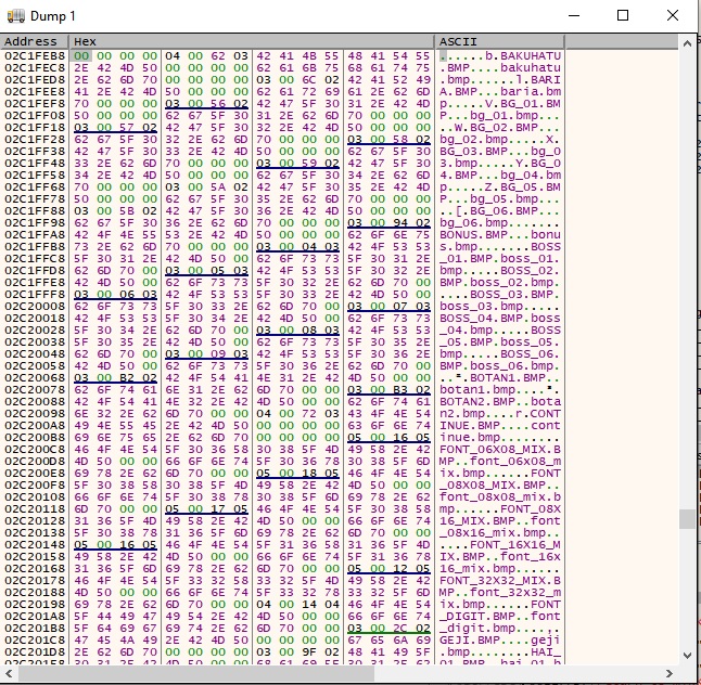 After a quick scripting section I had my files but I was unable to open them. Checking the hexdump of one of the .BMP (since they have a simple magic number) I’ve noticed that it’s shifted by 9 bytes. This probably means that the files are not saved in the archive as cleartext and maybe they are compressed. Probably the game uses this 9-byte header to recover the original file content.